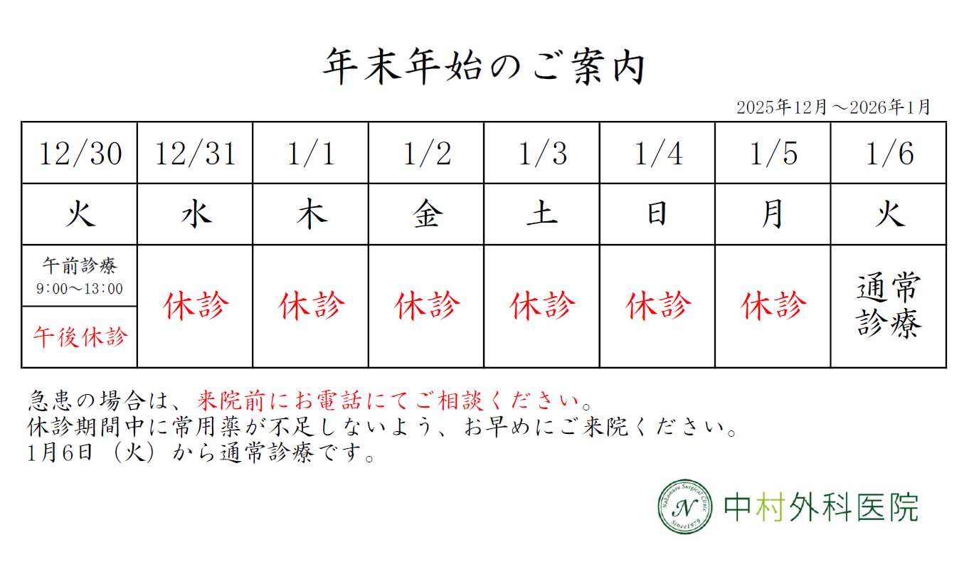 令和7年12月30日(火) 診療受付は 9:00 から 13:00 まで 午後の診療は休診です